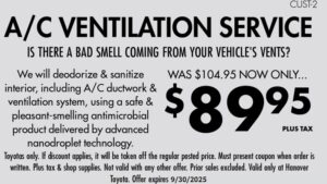 Hanover Toyota A/C Ventilation Service Central Pennsylvania Toyota Dealers ServiceHanover Toyota A/C Ventilation Service Expiration Date: September 30, 2025